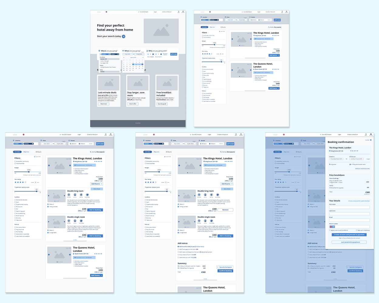 I was tasked with conducting user research to inform the design of a medium-fidelity prototype for an online hotel booking flow, reducing user friction and addressing pain-points.